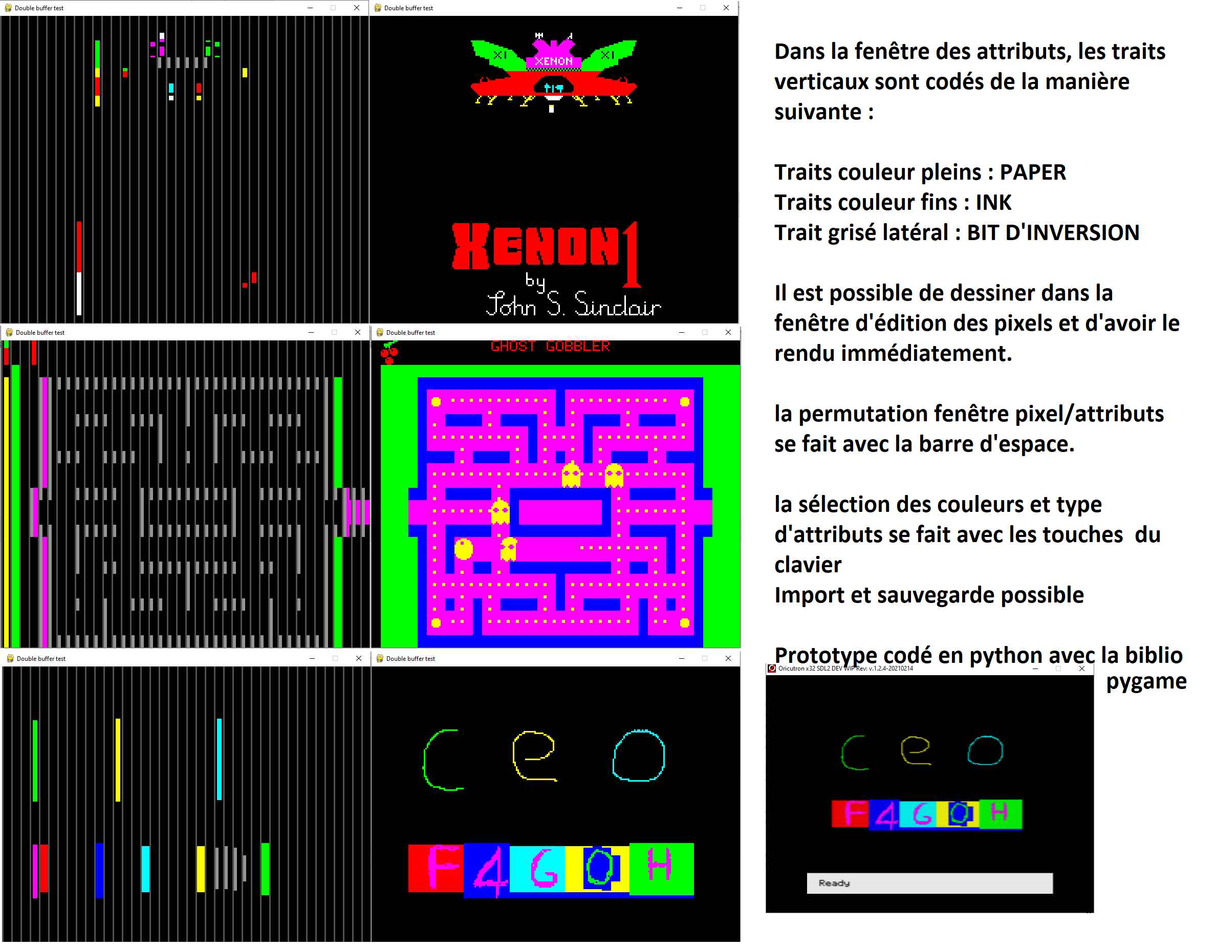 une fenêtre ou l'on peut faire un dessin pixel par pixel, une autre fenêtre ou l'on place les attributs de manière graphique et simple à comprendre.